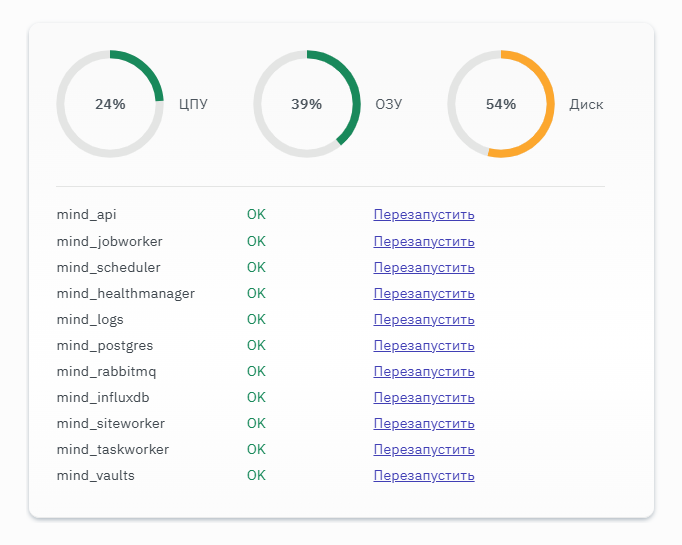 Восстановление должно выполняться на совместимой версии системы. Процесс резервного копирования и восстановления сопровождается даунтаймом, продолжительность которого зависит от скорости остановки и запуска сервисов: mind_system, mind_api, mind_healthmanager, mind_jobworker, mind_scheduler, mind_siteworker, mind_taskworker, mind_vaults.