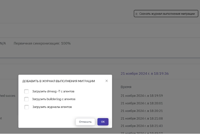 Для активных заданий на миграцию в разделе "Проекты" можно нажать кнопку Скачать журнал выполнения миграции. После нажатия на кнопку отобразится всплывающее окно с формой запроса, где пользователь может выбрать перечень логов для скачивания (рисунок 26):