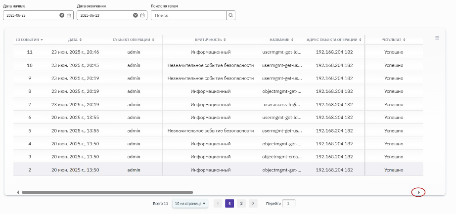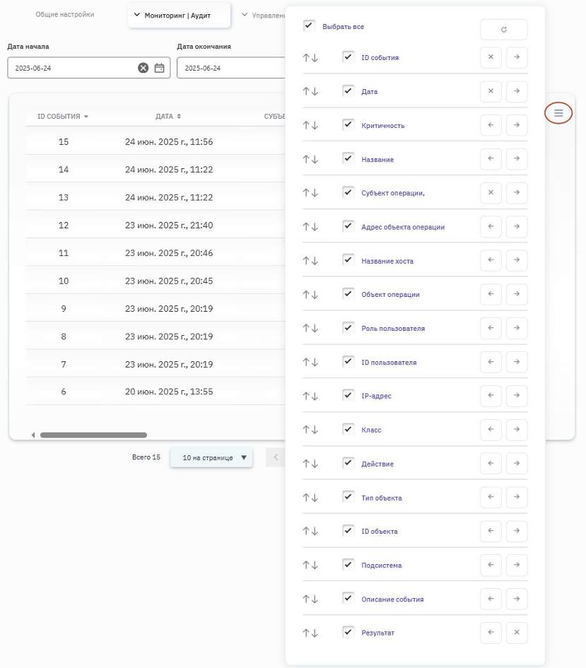 На вкладке "Аудит" доступен журнал аудита системных событий. События представлены отдельными строками, которые можно отфильтровать по датам, а также произвести поиск по тегам, основывающимся на информации в полях записей. Для просмотра нужных полей можно воспользоваться элементами прокрутки и управления отображением столбцов в таблице (рисунок 27).