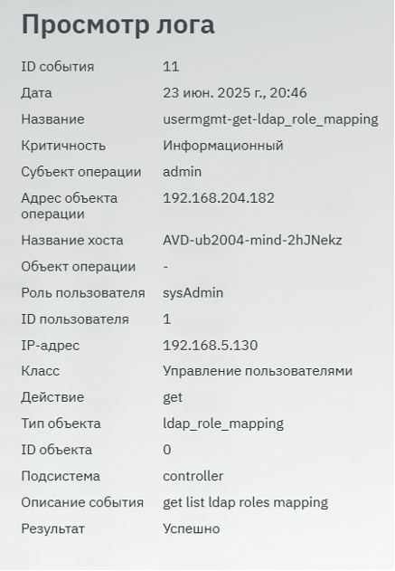 В поле "РОЛЬ ПОЛЬЗОВАТЕЛЯ" указана роль, назначенная учётной записи пользователя, выполнившего операцию. Подробная информация о ролевой модели приведена в документе .