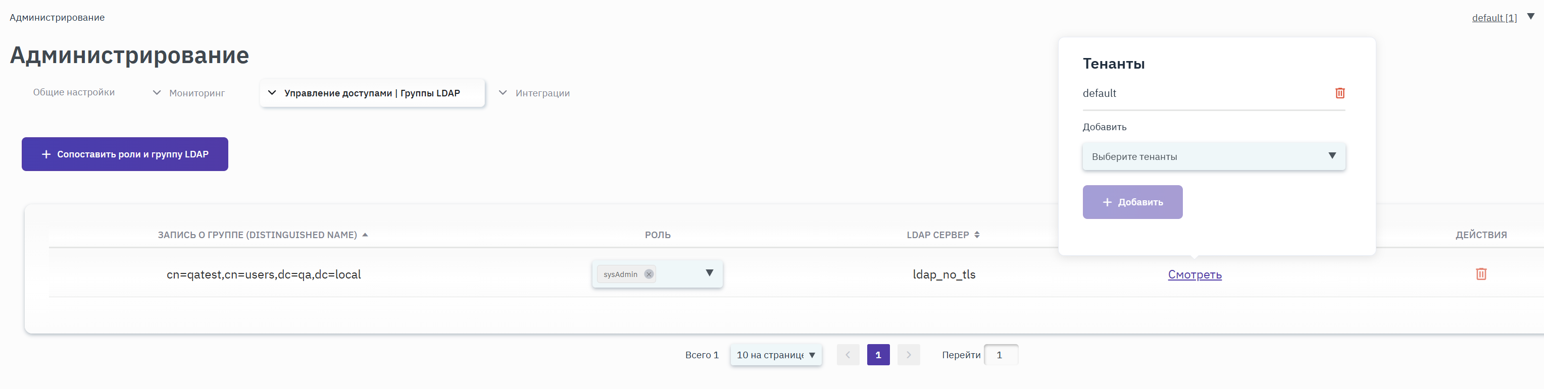 При необходимости пользователю могут быть назначены права доступа к нескольким тенантам, переключение между тенантами осуществляется Пользователем при нажатии на пиктограмму (треугольника) в правом верхнем углу окна интерфейса.