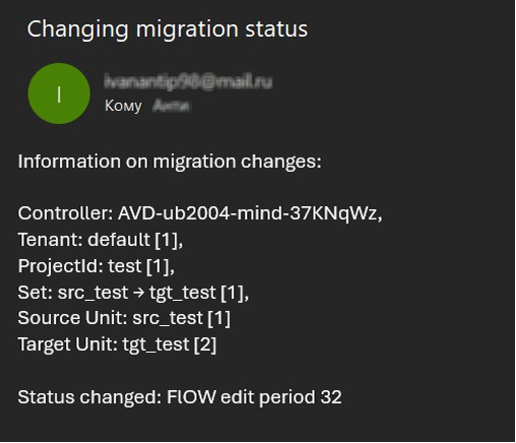 В интерфейсе Контроллера реализовано оповещение пользователя об изменении статусов его миграций в виде следующих всплывающих уведомлений: