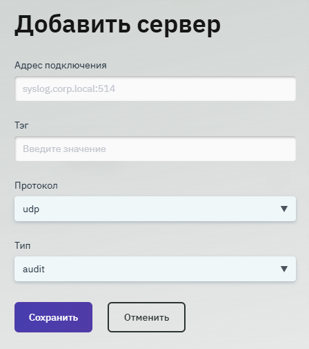 - в поле "Тип" выбрать соответствующий пункт. КомплексРуководитель поддерживает отправку логов через протокол syslog в двух режимах: