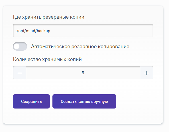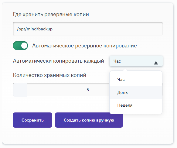Можно создать копии вручную, нажав соответствующую кнопку Создать копию вручную. Для настройки автоматического резервного копирования необходимо установить переключатель в активное положение. Отобразятся дополнительные поля, которые следует заполнить в соответствии с желаемым интервалом копирования. После внесения изменений необходимо нажать на кнопку Сохранить.