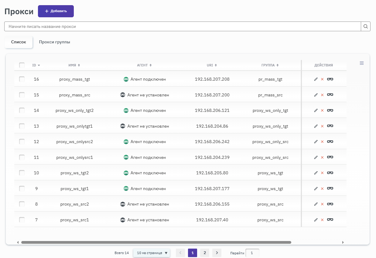 Работа с прокси-серверами выполняется в разделе "Прокси" в веб-интерфейсе Контроллера. На вкладке "Список" отображаются все прокси-серверы, зарегистрированные на данном Контроллере (рисунок 14).