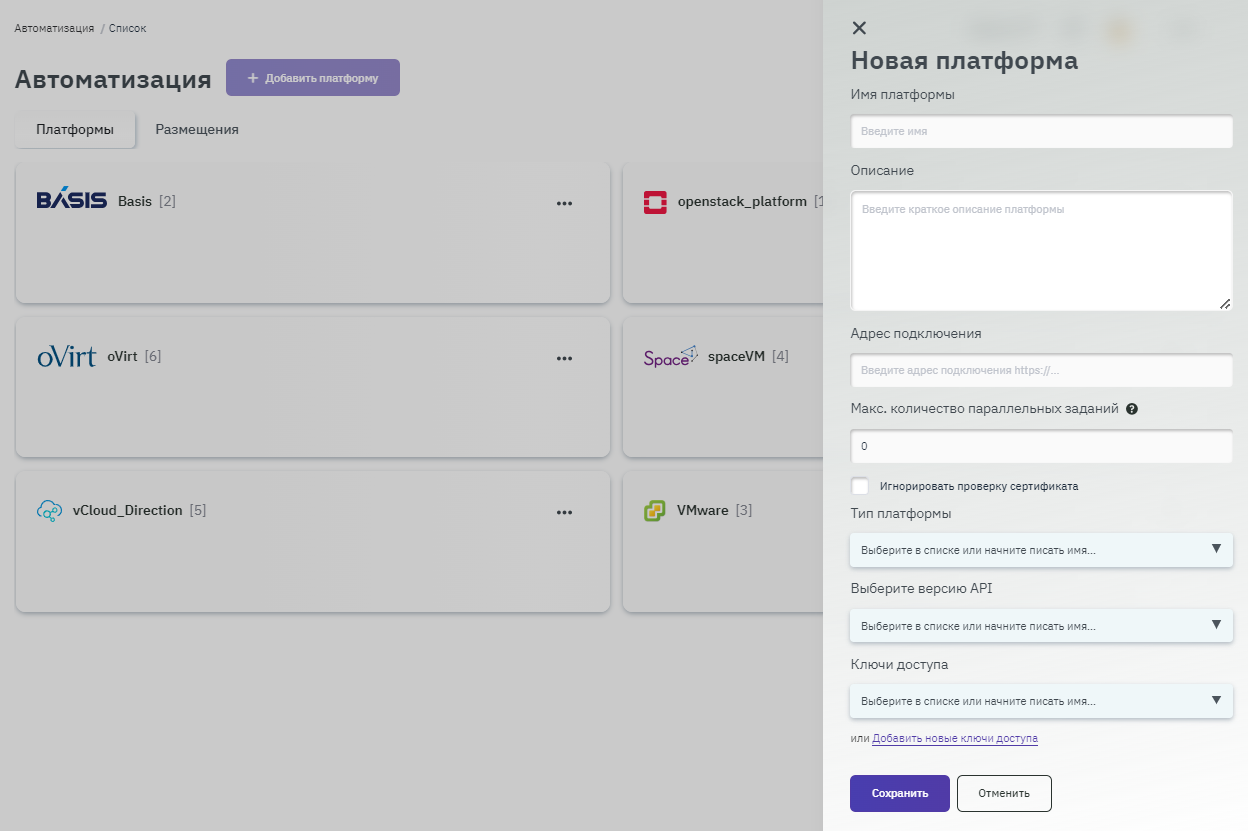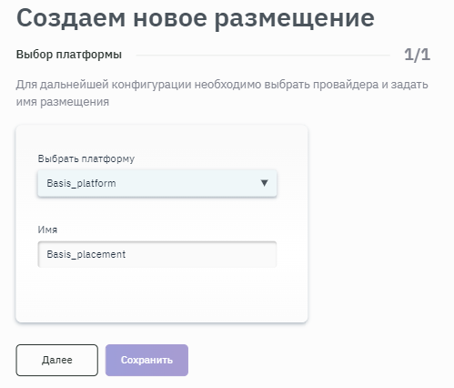 - Для дальнейшей конфигурации выбрать провайдера и задать имя размещения, выбрать платформу Basis и ввести название размещения в соответствующих полях. Подробная информация о создании платформ приведена в п. Создание платформы (рисунок 125).