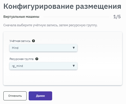 - после запуска процесса конфигурирования размещения выбрать учетную запись и ресурсную группу (рисунок 126).