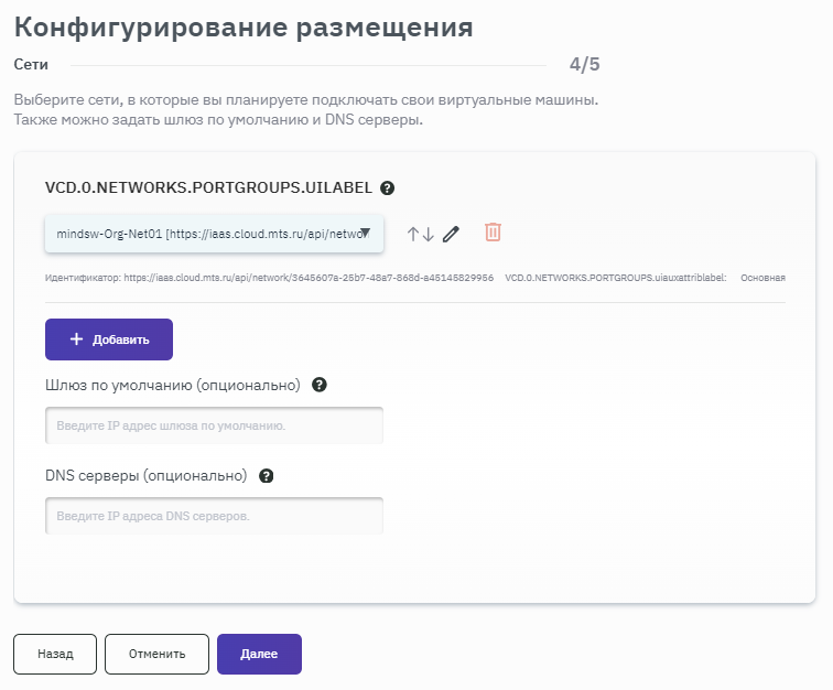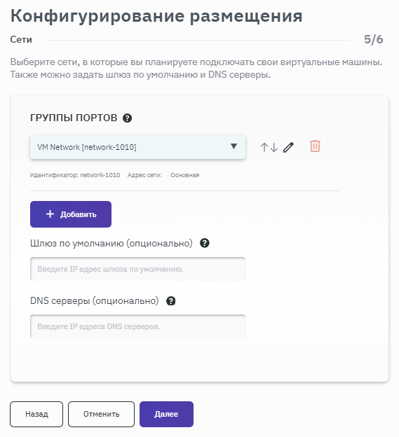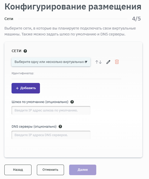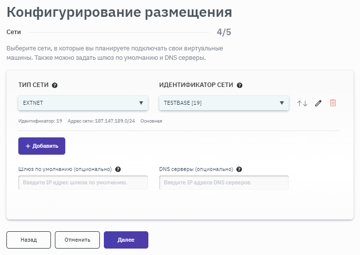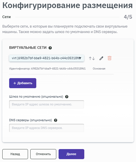 - Если во время создания размещения было добавлено несколько сетей, то при нажатии на кнопку + Добавить будет предоставлена возможность выбора дополнительных сетей для создания интерфейса.