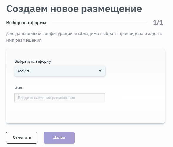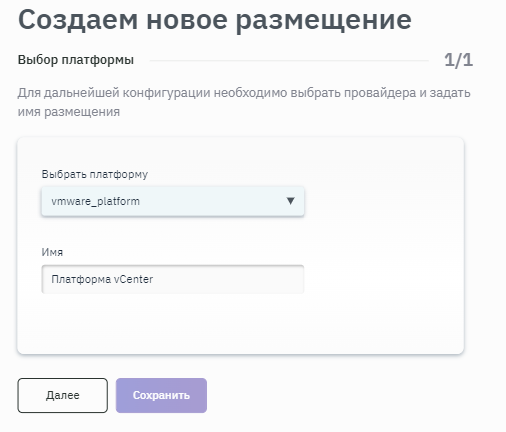 - Для дальнейшей конфигурации выбрать провайдера и задать имя размещения, выбрать платформу vCenter и ввести название размещения в соответствующих полях. Подробная информация о создании платформ приведена в п. Создание платформы (рисунок 131).