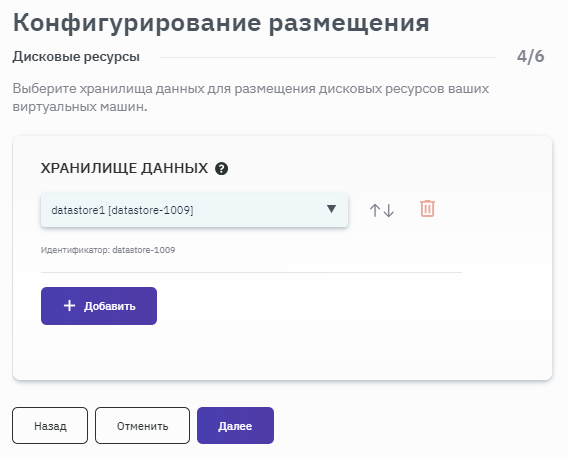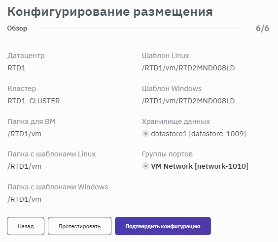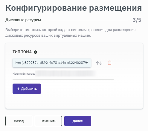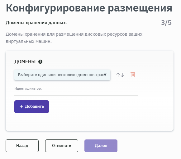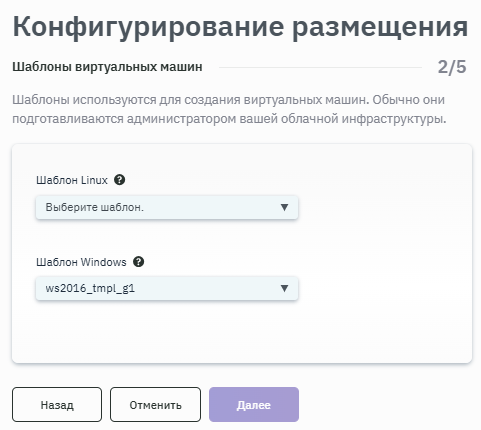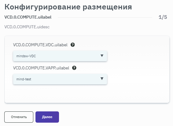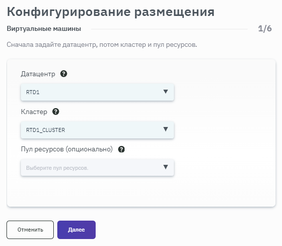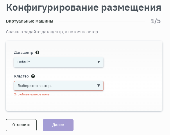 - После запуска процесса конфигурирования размещения выбрать место расположения ВМ, заполнив соответствующие поля значениями из выпадающего списка (рисунок 133).