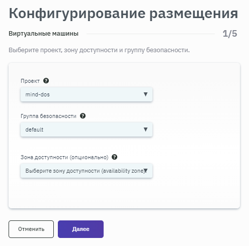 - После запуска процесса конфигурирования размещения выбрать проект и ресурсную группу. При необходимости можно также выбрать место расположения ВМ (рисунок 147).