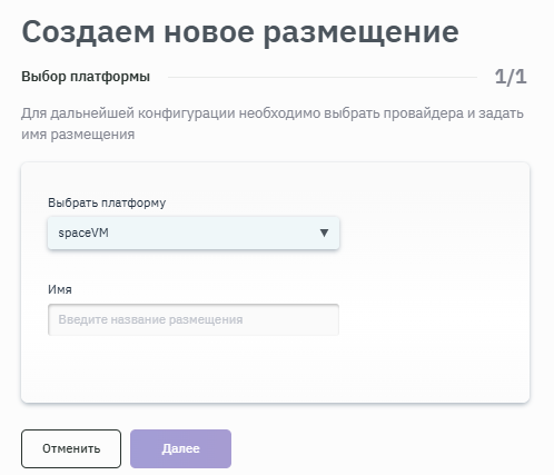 - Для дальнейшей конфигурации выбрать провайдера и задать имя размещения, выбрать платформу SpaceVM и ввести название размещения в соответствующих полях. Подробная информация о создании платформ приведена в п. Создание платформы (рисунок 153).