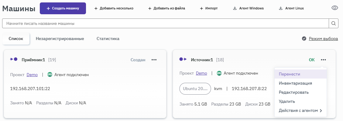 - В разделе Машины выбрать необходимый источник со статусом "ОК" и нажать на пиктограмму (три точки).