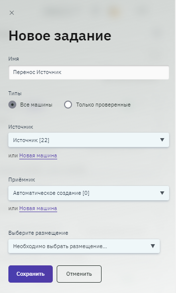 - Ввести название задания в поле "Имя", установить тип машин, выбрать источник. Возможно выбрать из уже добавленных на Контроллер машин (всех или только тех, которые прошли проверку) или создать новые. Чтобы создать новые машины, нужно нажать Новая машина и в открывшемся окне заполнить обязательные поля для создания источника и приемника (см. п. Раздел "Машины").