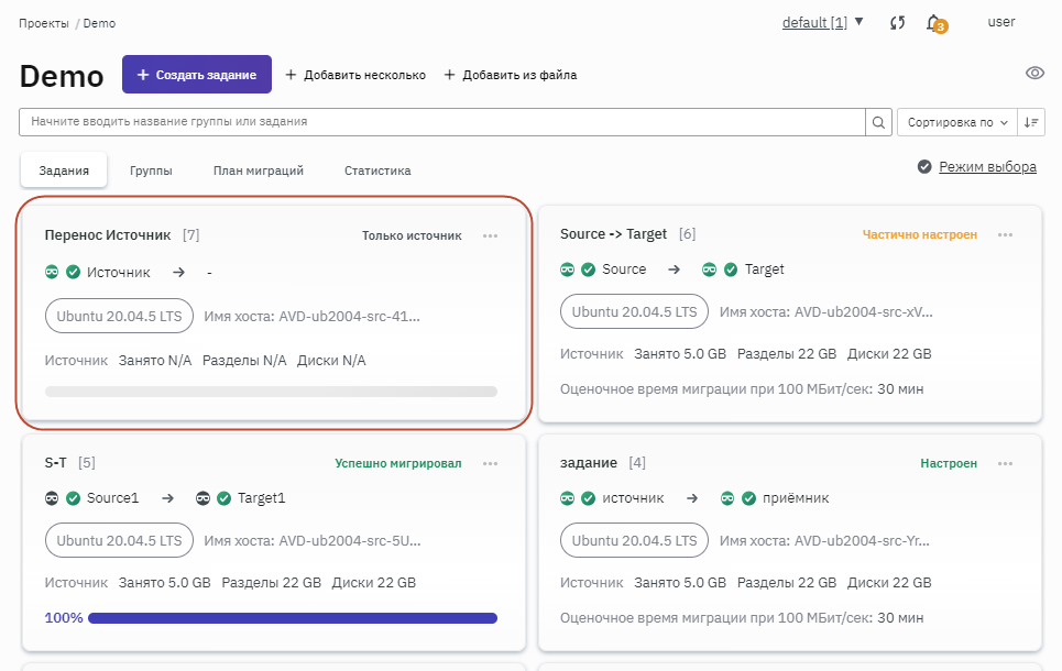 - Нажать кнопку Сохранить. Задание на перенос появится в списке миграционных заданий со статусом "Только источник" (рисунок 168).