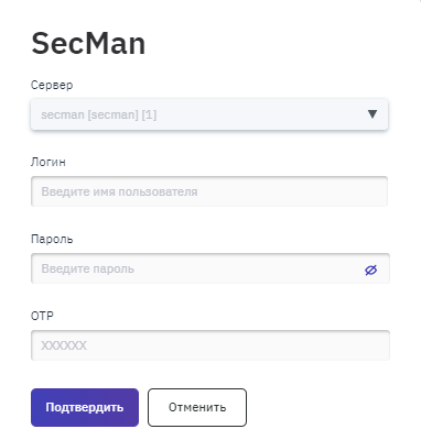 Примечание – Если при создании платформы в поле "Ключи доступа" был выбран ключ с типом SecMan, то перед началом конфигурирования размещения отобразится окно подключения к SecMan (рисунок 146). В окне необходимо ввести логин и пароль подключения к серверу, а также пароль OTP, действительный только для одного сеанса аутентификации. Все данные необходимо уточнять у Администратора Комплекса.
