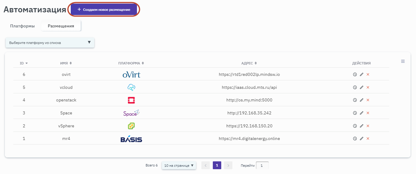 Для создания в графическом интерфейсе РОСА Миграция новой платформы в разделе "Автоматизация" на вкладке "Платформы" нужно нажать кнопку + Добавить платформу (рисунок 123).