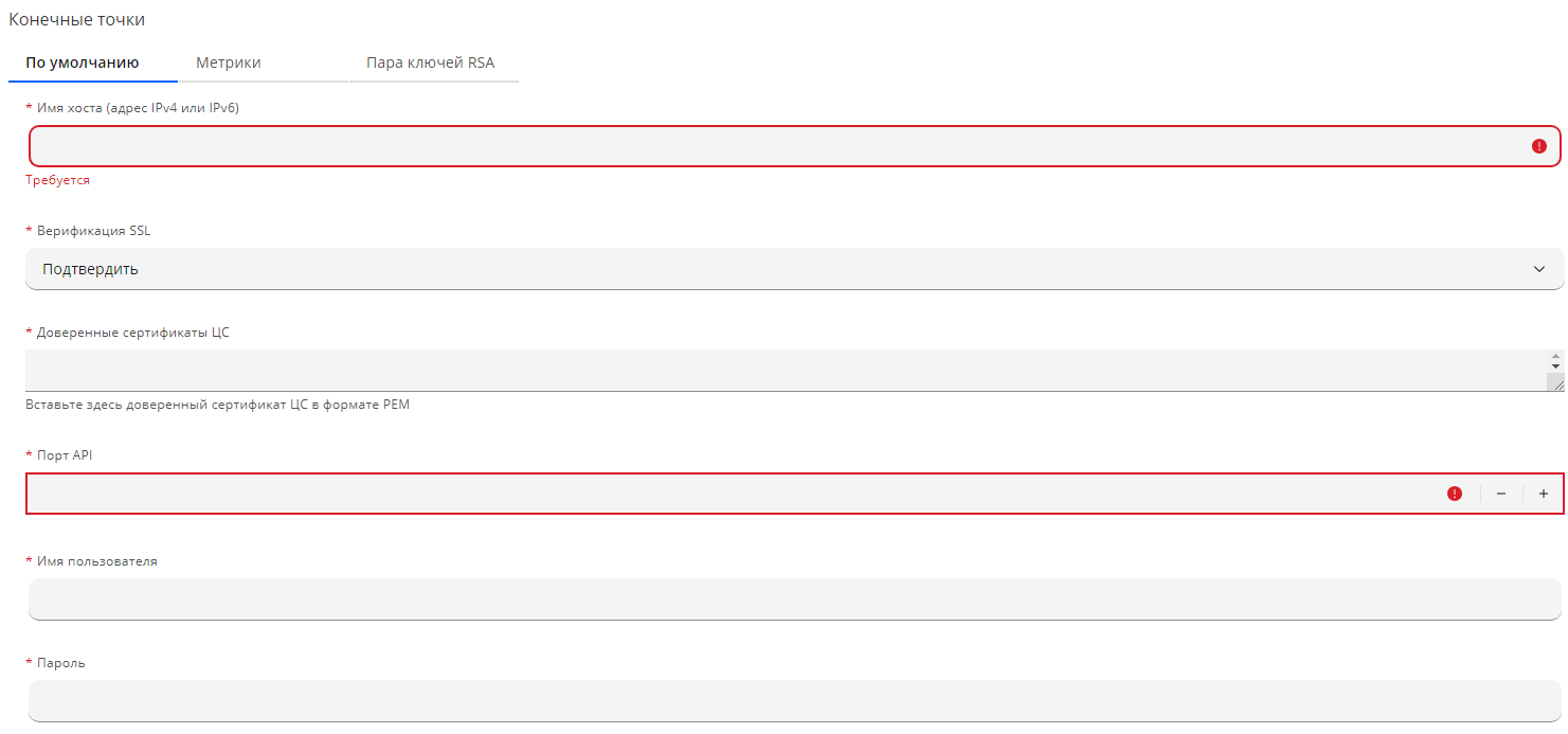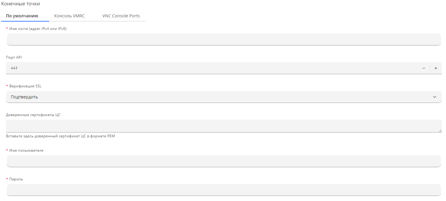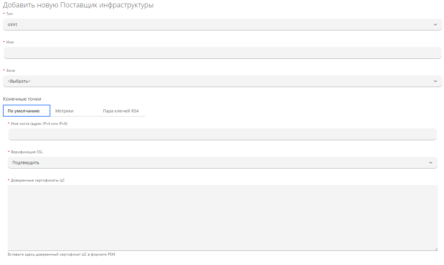 Перечень параметров в секции "Конечная точка" аналогичен поставщику инфраструктуры ROSA Virtualization.