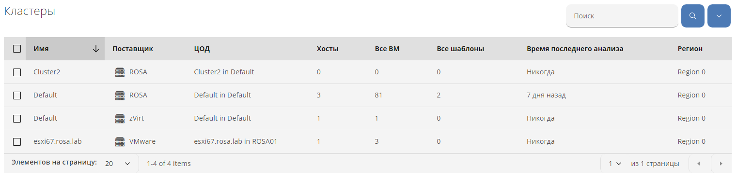 Для работы с кластерами нужно выбрать в меню панели навигации "Ресурсы Инфраструктура Кластеры". В рабочей области отобразится перечень кластеров в составе всех подключенных к Комплексе поставщиков инфраструктуры в виде таблицы с наименованием кластера, поставщика, ЦОД, количеством хостов, ВМ и шаблонов (рисунок 58).