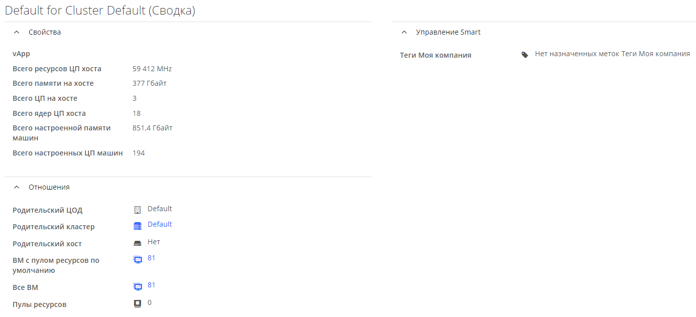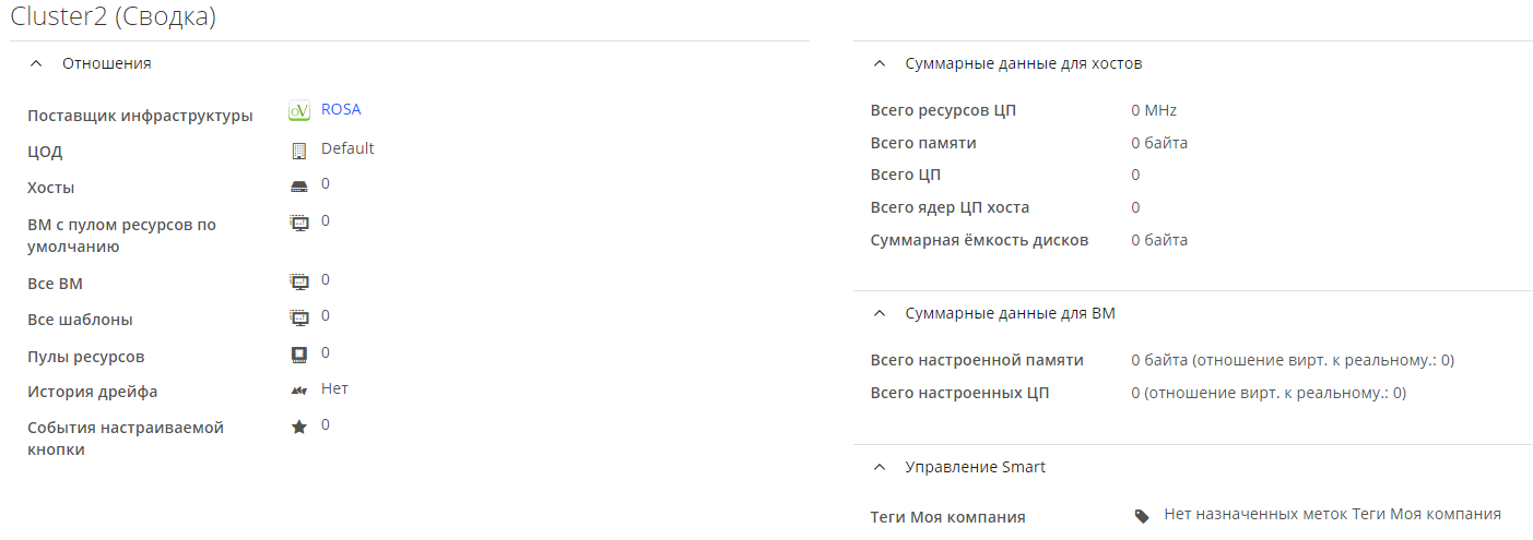 Для обзора сведений о кластере нужно нажать на его наименование в списке. В рабочей области отобразится сводка сведений в составе следующих секций (рисунок 59):