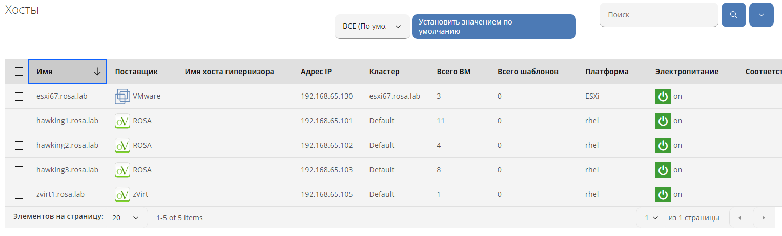 Для работы с хостами нужно выбрать в меню панели навигации "Ресурсы → Инфраструктура → Хосты". В рабочей области отобразится перечень хостов в составе всех подключенных к Комплексе поставщиков инфраструктуры в виде таблицы с наименованием хоста, поставщика, именем хоста гипервизора, IP-адреса, кластера, количеством ВМ и шаблонов, платформы, состоянием электропитания, соответствием требованиям, временем последнего анализа, статусом аутентификации (рисунок 60).