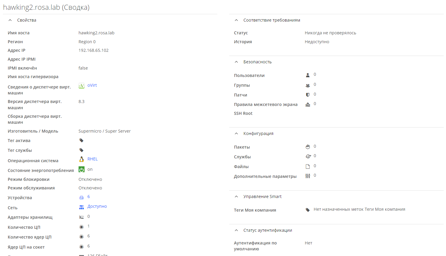 Для обзора сведений о хосте нужно нажать на его наименование в списке. В рабочей области отобразится сводка сведений в составе следующих секций (рисунок 61):