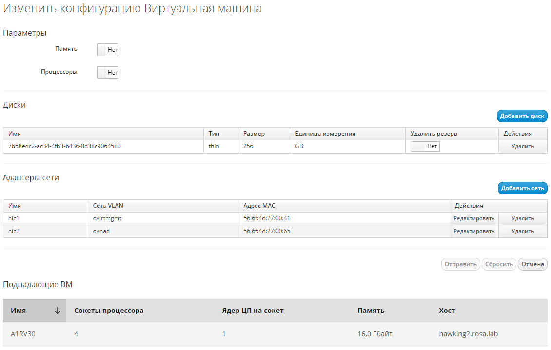 - Свойства – идентификатор, имя, описание, имя хоста, IP-адреса, MAC-адрес, контейнер, платформа родительского хоста, инструменты платформы, ОС, признак схожести ЦП, устройства, снимки, дополнительные параметры, доступность ресурсов, доступно, GUID подсистемы управления, признак защищённости;