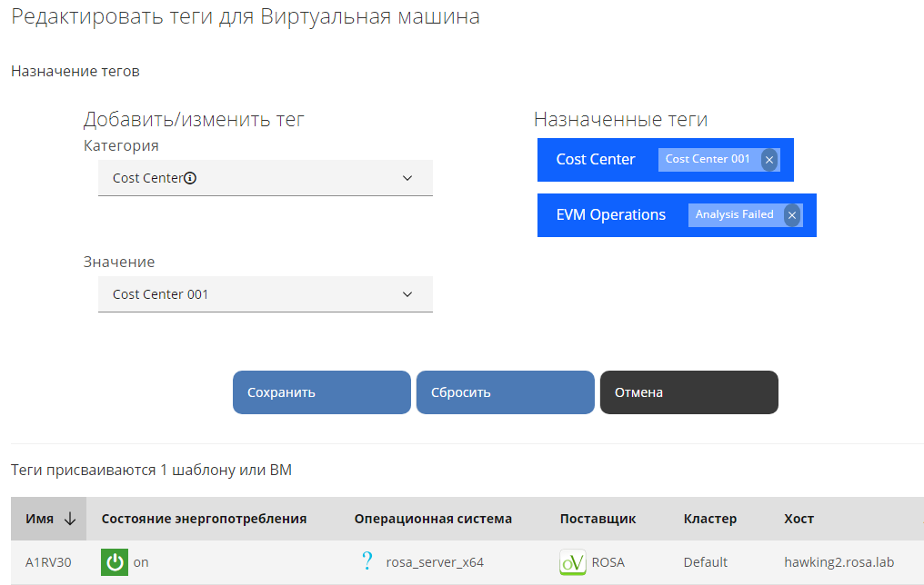 - Редактировать теги – выбрать "Категории" и "Значения" для назначения тегов пулу ресурсов.