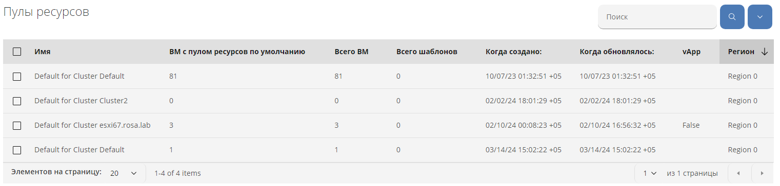 Для работы с пулами ресурсов нужно выбрать в меню панели навигации "Ресурсы Инфраструктура Пулы ресурсов". В рабочей области отобразится перечень пулов ресурсов в виде таблицы с наименованиями, количествами ВМ с пулом ресурсов по умолчанию, всего ВМ, всего шаблонов, временем создания, временем обновления, признаком контейнера vApp, регионом (рисунок 70).