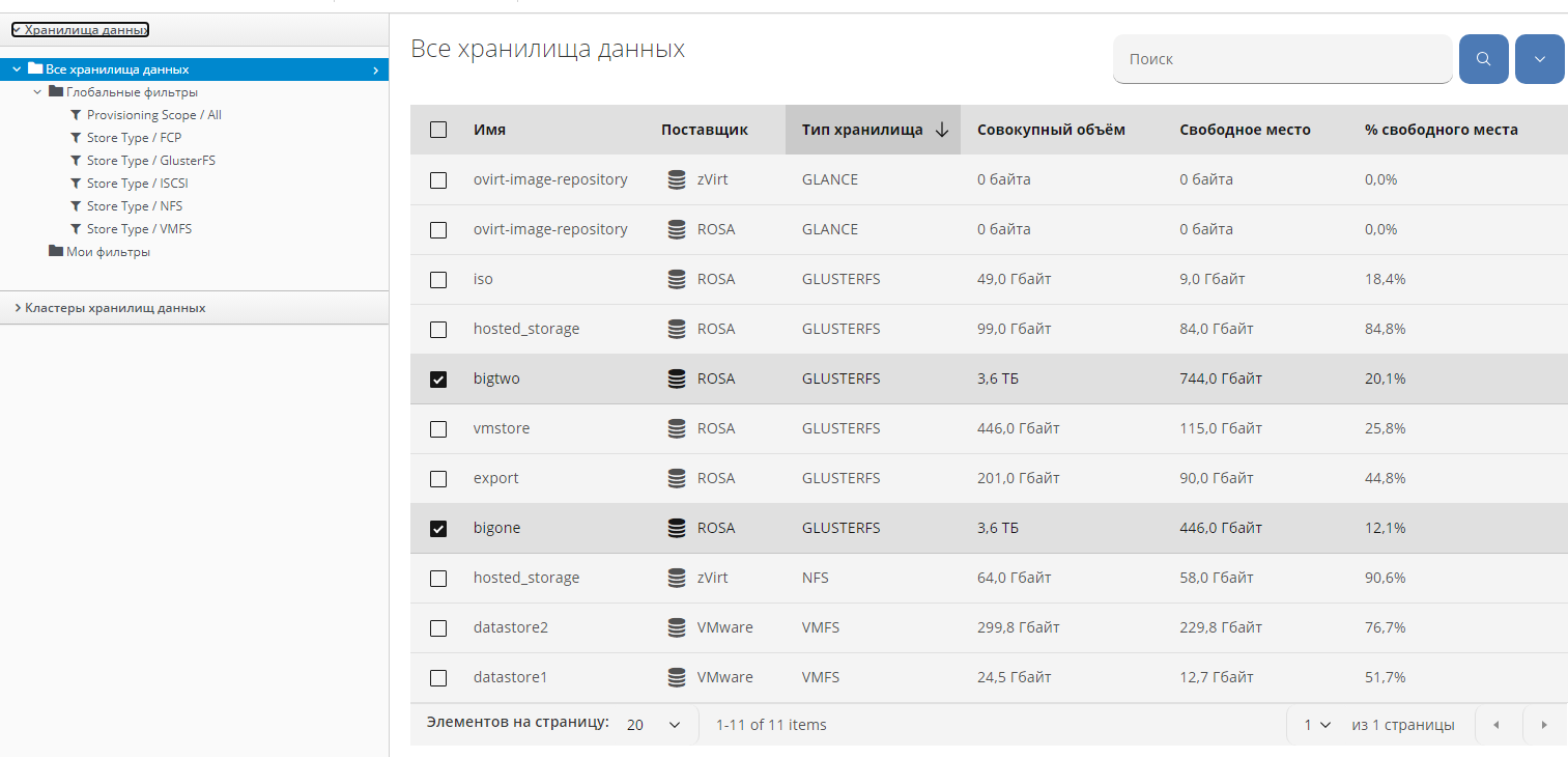Для работы с хранилищами данных, предоставляемыми поставщиками инфраструктуры, нужно выбрать в меню панели навигации "Ресурсы Инфраструктура Хранилища данных". В рабочей области в левой панели отобразятся аккордеоны "Хранилища данных" и "Кластеры хранилищ данных", в которых в иерархическом виде показаны встроенные фильтры "Глобальные фильтры" по типу хранилища и пользовательские фильтры, в правой панели –перечень хранилищ, удовлетворяющих выбранному фильтру, в виде таблицы с наименованием хранилища, поставщика, типом, совокупным объемом, свободным местом, количеством ВМ разного типа и пр. (рисунок 72).
