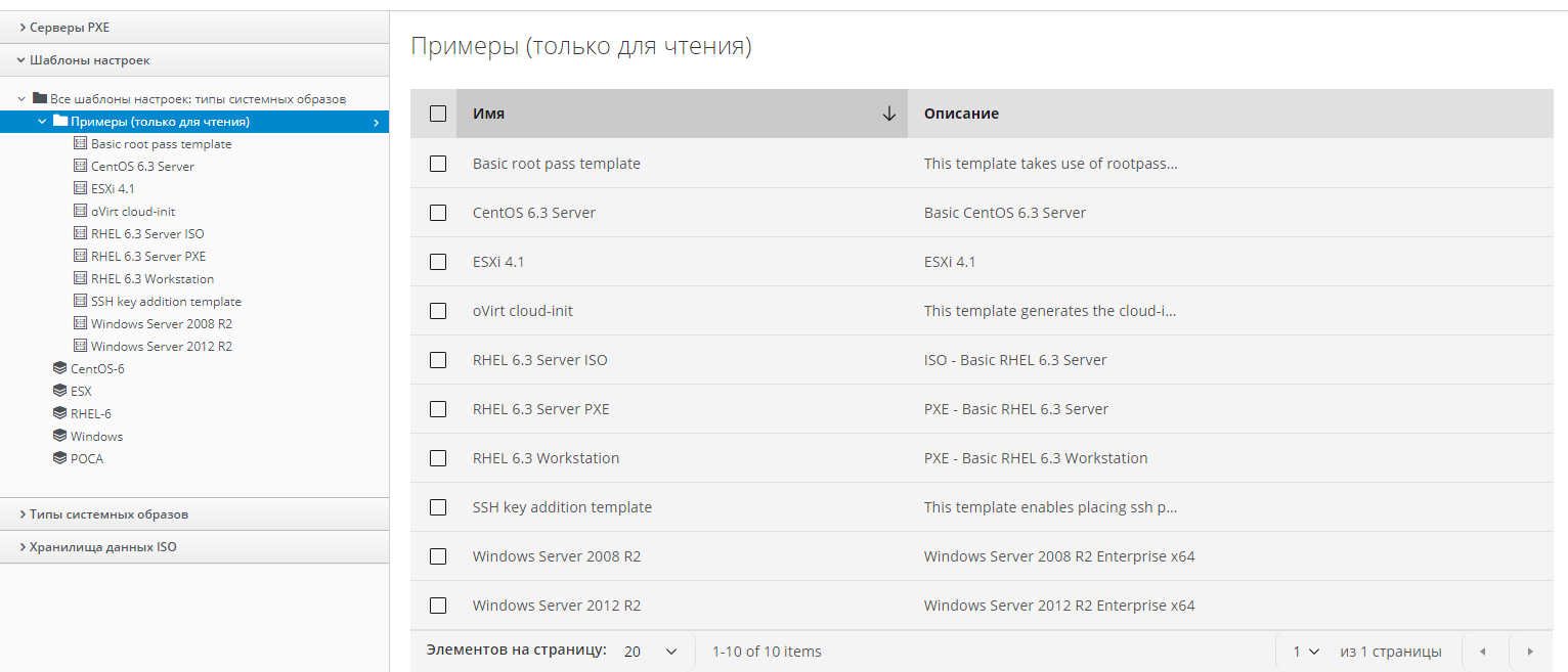 Для работы с шаблонами настроек нужно выбрать в меню панели навигации "Ресурсы Инфраструктура PXE", в левой панели рабочей области развернуть аккордеон "Шаблоны настроек" и выбрать "Все шаблоны настроек: типы системных образов", в котором размещены встроенные папки примеров шаблонов и шаблонов для разных типов системных образов. В правой панели рабочей области отобразится перечень шаблонов настроек в виде таблицы с наименованием и описанием (рисунок 76).