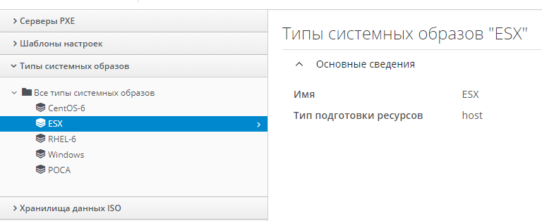 Для работы с типами системных образов нужно выбрать в меню панели навигации "Ресурсы Инфраструктура PXE", в левой панели рабочей области развернуть аккордеон "Типы системных образов" и выбрать "Все типы системных образов", в котором размещены встроенные типы системных образов. В правой панели рабочей области отобразится описание типа системного образа (рисунок 78).