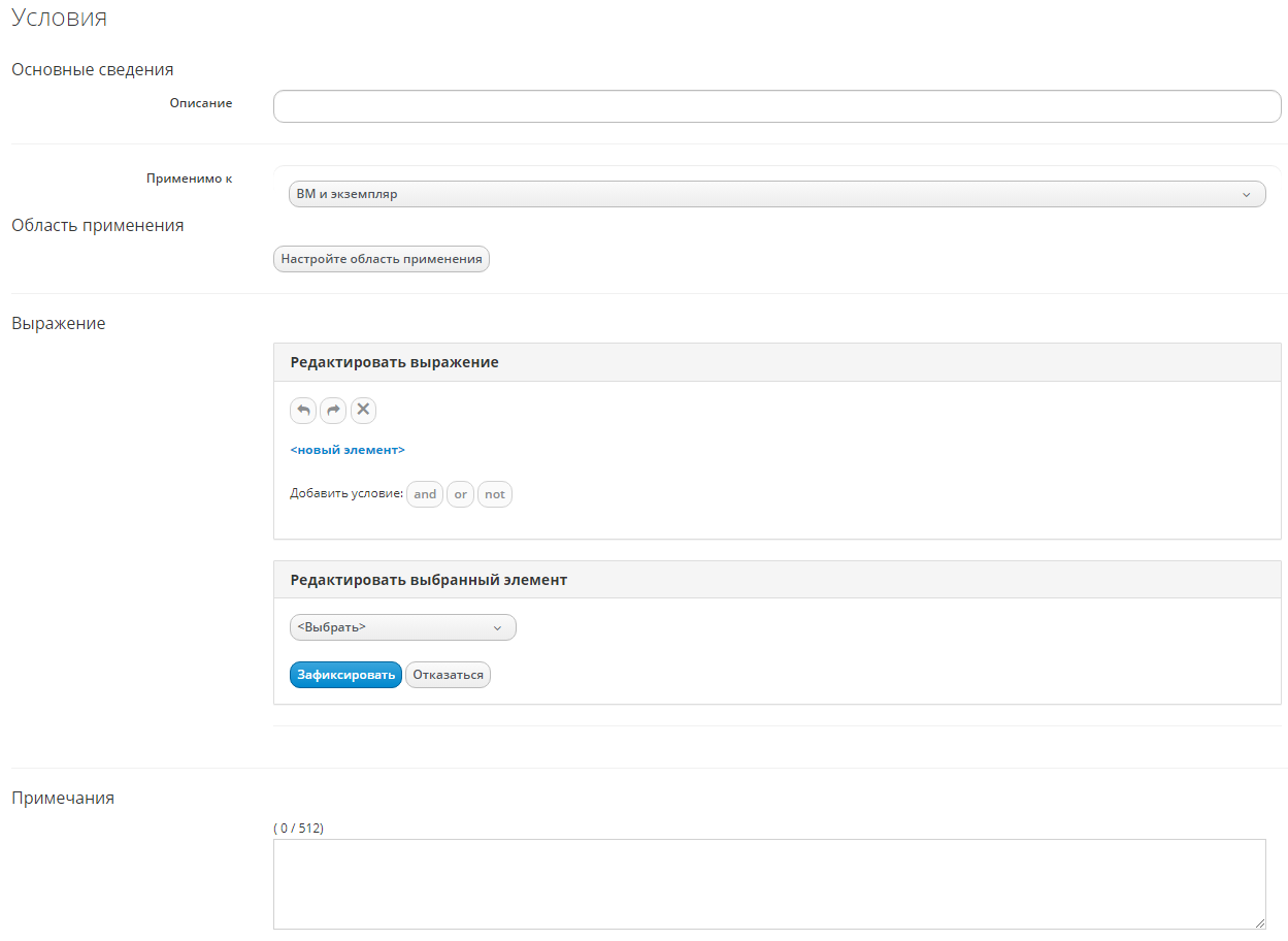 Условия – это проверки, которые выполняются над характеристиками ВМ. Условия может содержать два элемента: область действия и выражение. Выражение является обязательным, но область действия не является обязательной. Область действия – это общий атрибут, который быстро проверяется перед вычислением более сложного выражения. Например, можно использовать область для проверки ОС и использовать выражение для проверки определенного набора приложений или исправлений безопасности, которые применяются только к ОС, указанной в области. Если для политики не определены условия, область действия или выражение, политика считается безусловной и возвращает значение "TRUE (ИСТИНА)".