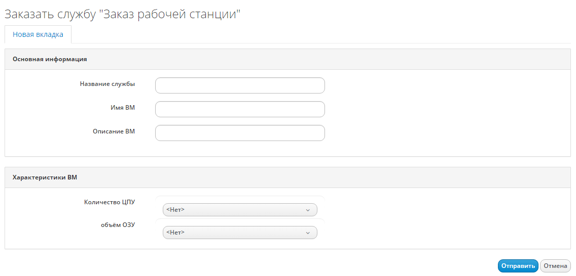 При выборе в левой панели в аккордеоне "Каталоги служб" конкретной службы каталога в правой панели появится описание основных сведений службы, связанного диалога и кнопка Заказать, по нажатию на которую можно перейти к диалогу для заявки на службу, заполнить параметры и нажать кнопку Отправить (рисунок 181).