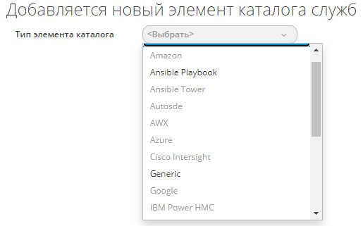 - на экране появится интерфейс "Добавление нового элемента каталога служб", в котором нужно выбрать один из типов элемента – "Ansible Playbook", "Generic", "oVirt", "VMware", "VMwate Content Library OVF Template" и задать во вкладках параметры, состав которых зависит от выбранного типа элемента (рисунок 183).