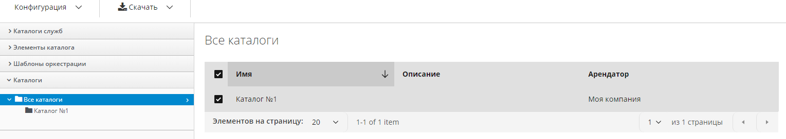 Для работы с каталогами служб нужно выбрать в меню панель навигации "Службы Каталоги"; в левой панели рабочей области отображаются аккордеоны "Каталоги служб", "Элементы каталога", "Шаблоны оркестрации", "Каталоги", которые разворачиваются до вложенных каталогов и элементов в иерархическом виде, в правой – списки элементов каталогов или содержание элементов (рисунок 180).