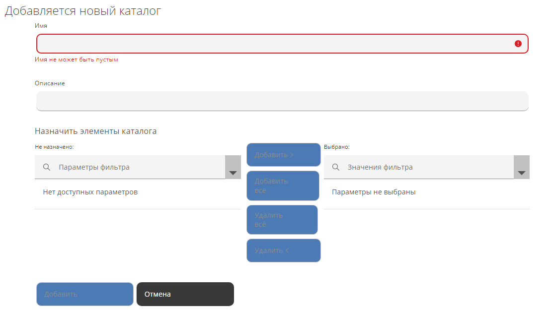 - "Назначить элементы" – выбрать параметры фильтров из списка "Не назначено" в список "Выбрано" для назначения этому каталогу элементов, используя кнопки Добавить, Добавить все, Удалить, Удалить все.