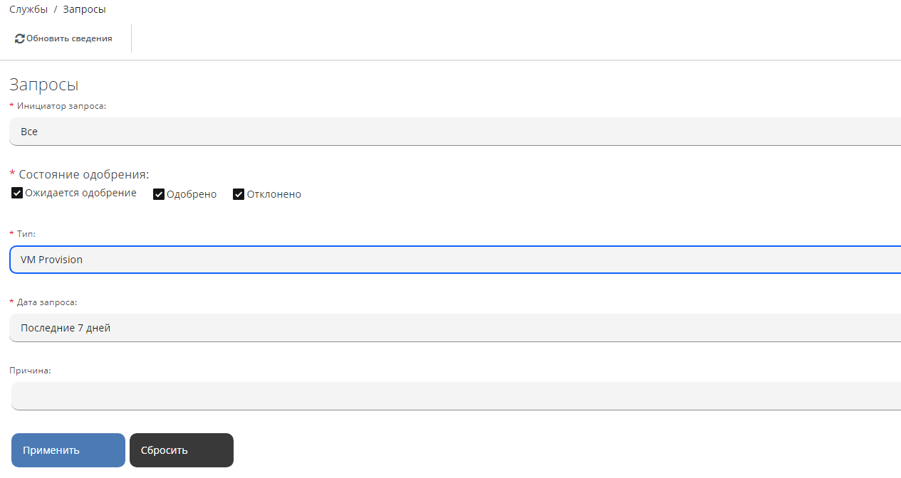 Для просмотра, подтверждения или предоставления ВМ или экземпляра в Комплексе используется механизм запросов.