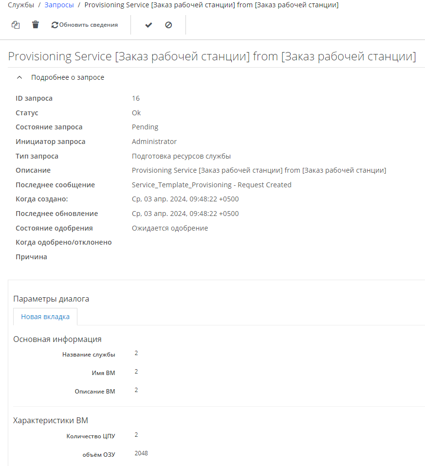 - копировать исходный запрос; задать параметры скопированного запроса в части описания и характеристик ВМ;