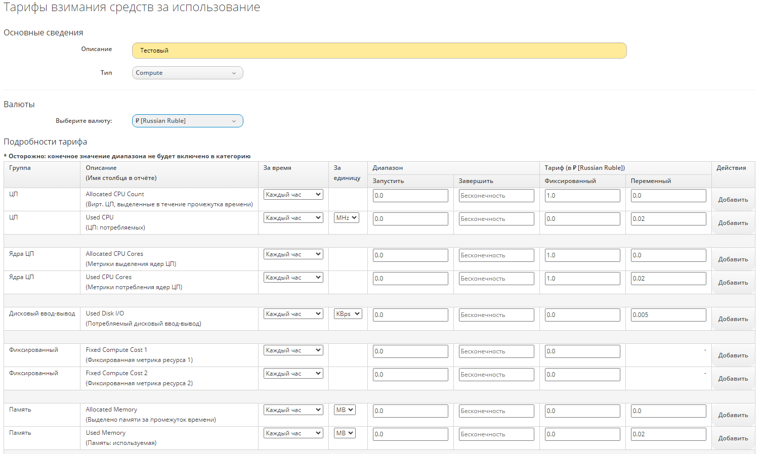 - в секции "Подробности тарифа", например, выбрать временной интервал "Каждый час" из раскрывающегося списка в строке "Количество выделенных ЦП" из группы "ЦП", затем настроить для каждого уровня свои диапазоны значений и ставки: