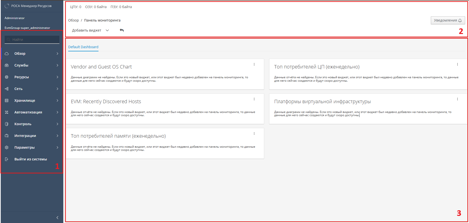 Веб-интерфейс Комплекса состоит из панели навигации с доступными пользователю вкладками, панели быстрого доступа с функциональными пиктограммами, а также рабочей области, в которой по умолчанию (при входе пользователя в систему) отображается панель мониторинга (рисунок 2):