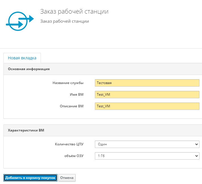 - в секции "Основная информация": в поле "Название службы" ввести краткое наименование; в поле "Имя ВМ" – имя ВМ; в поле "Описание ВМ" – развернутое описание ВМ (при необходимости);