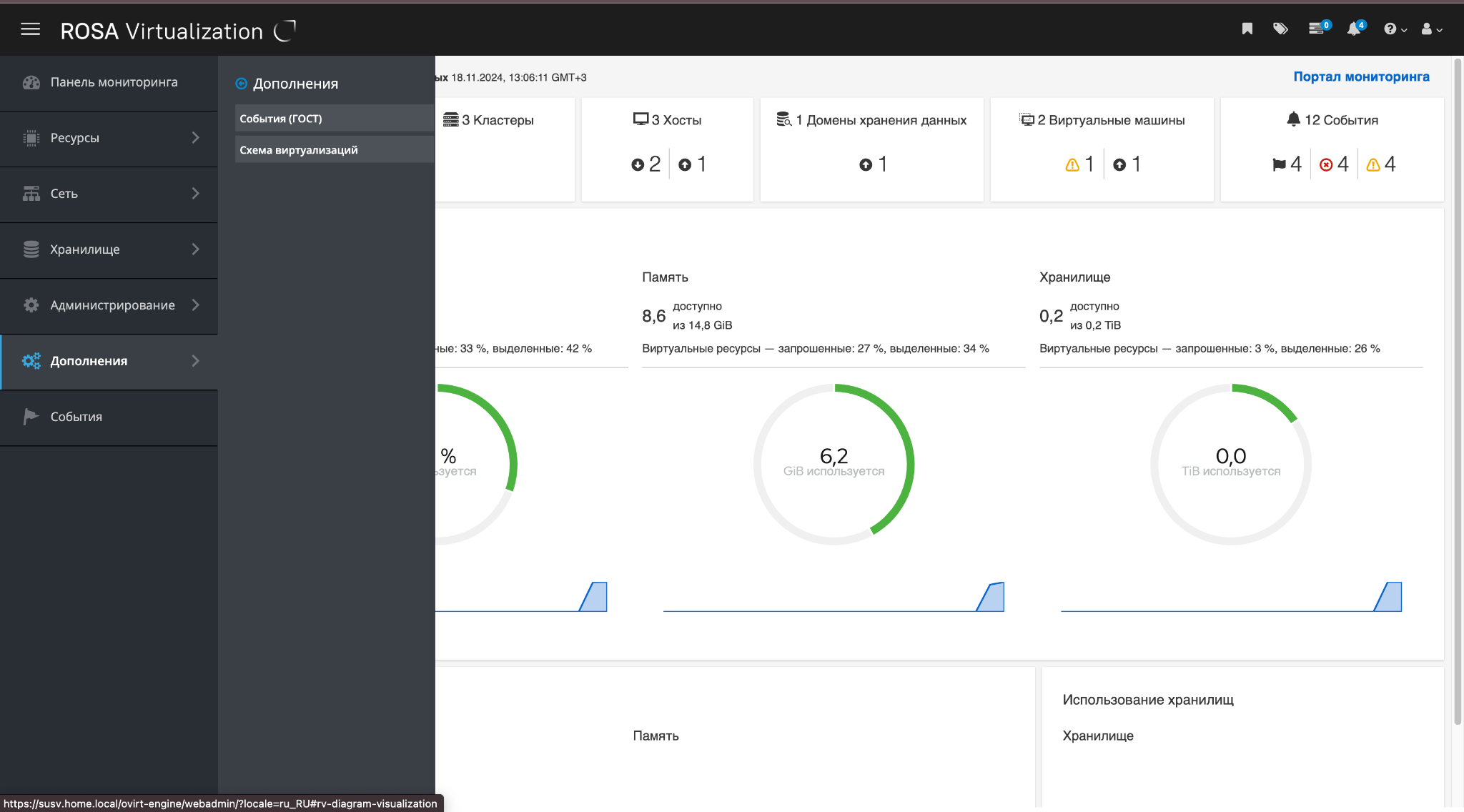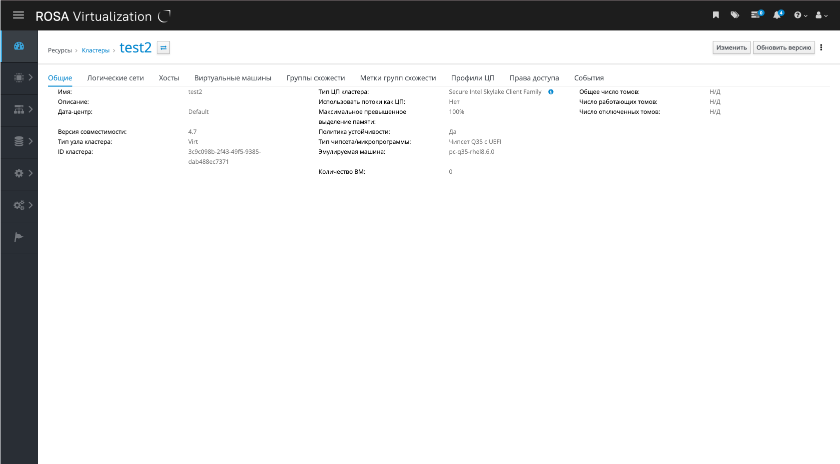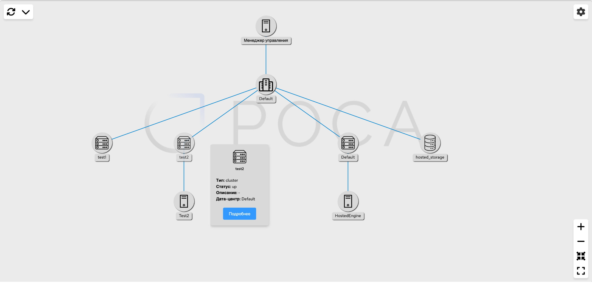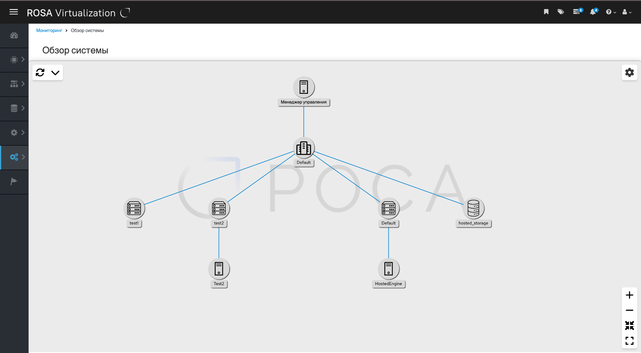 Рисунок 12 ‒ Ресурсы РОСА Виртуализация: "Виртуальные машины", "Шаблоны", "Пулы", "Хосты", "Дата-центры", "Кластеры"