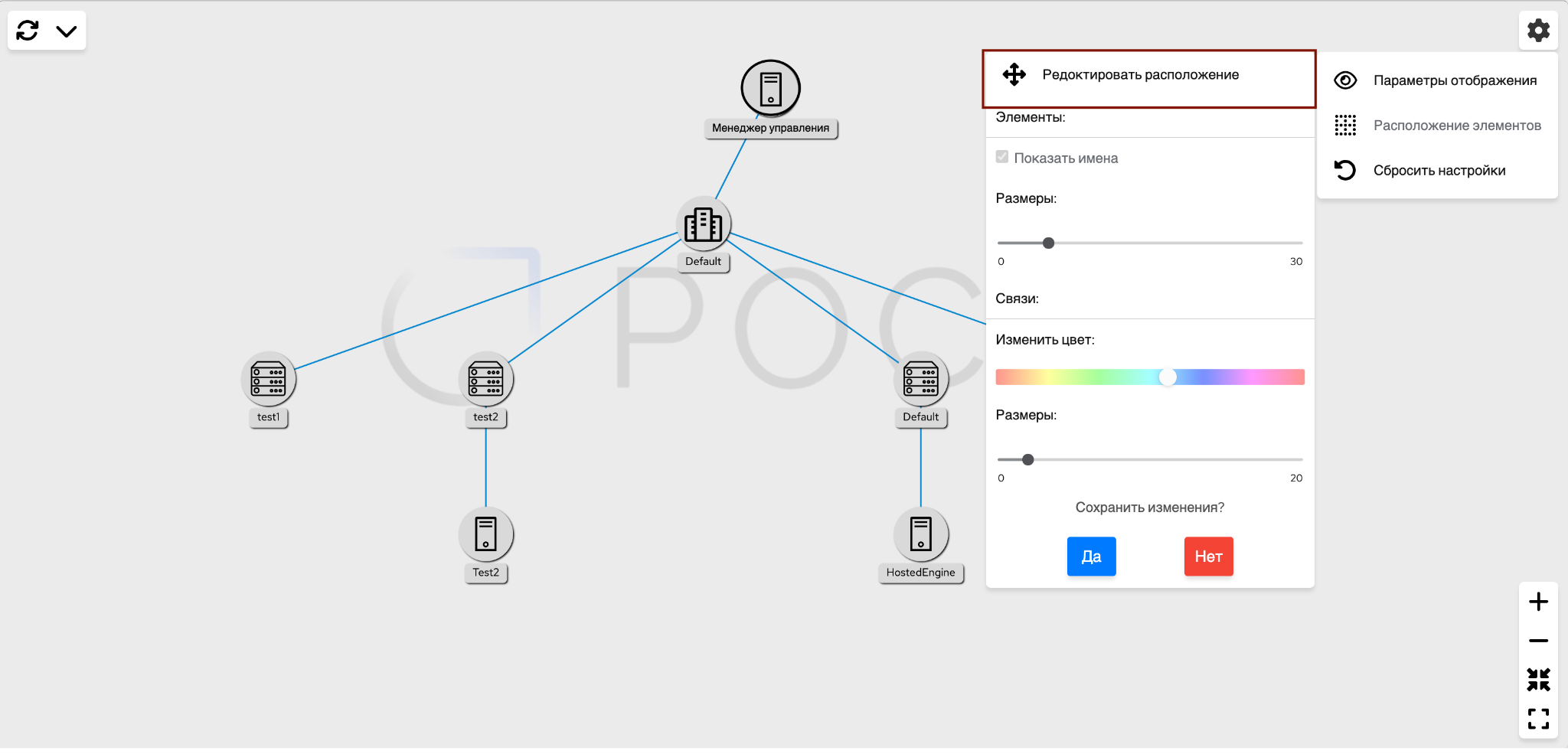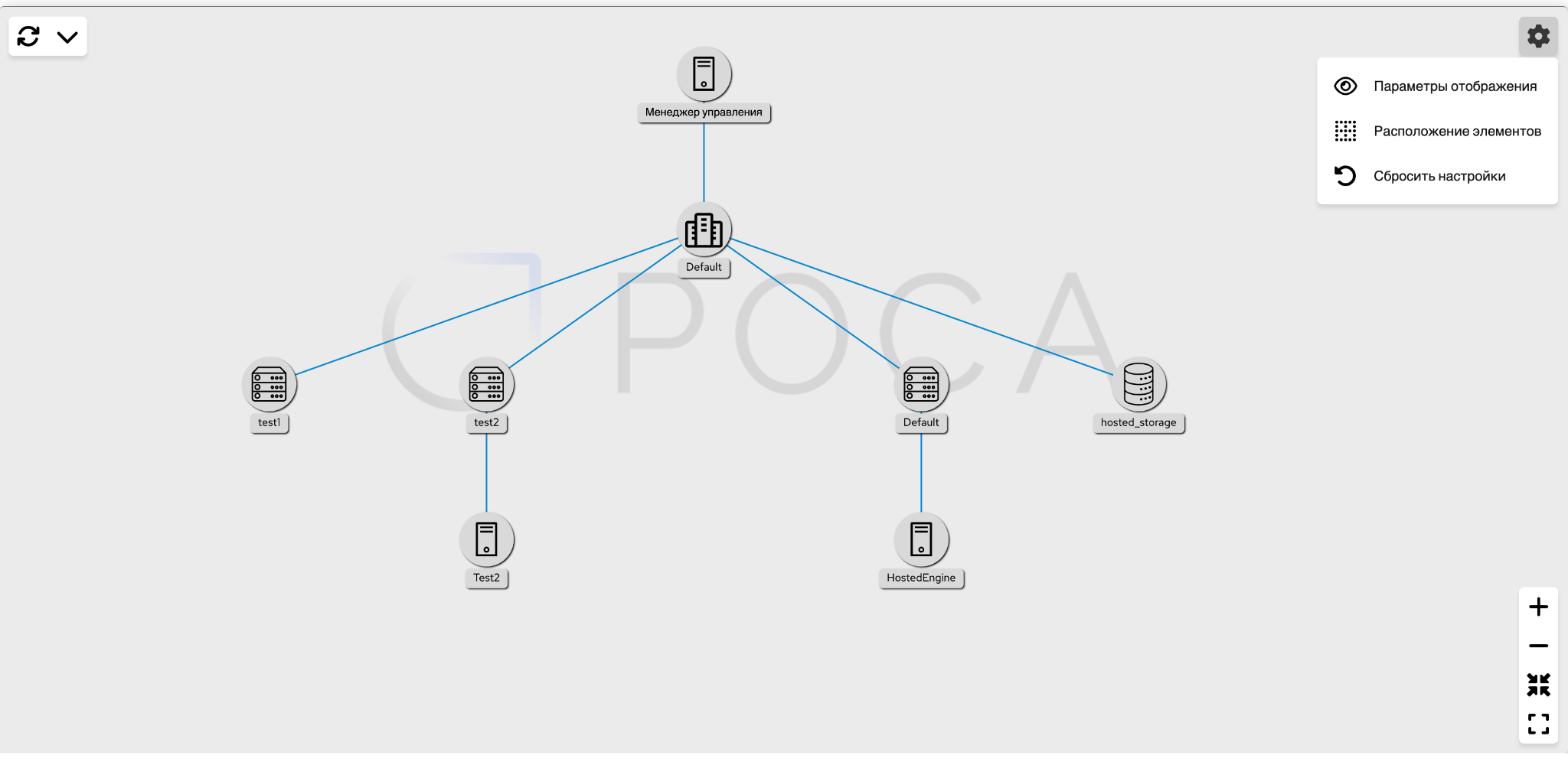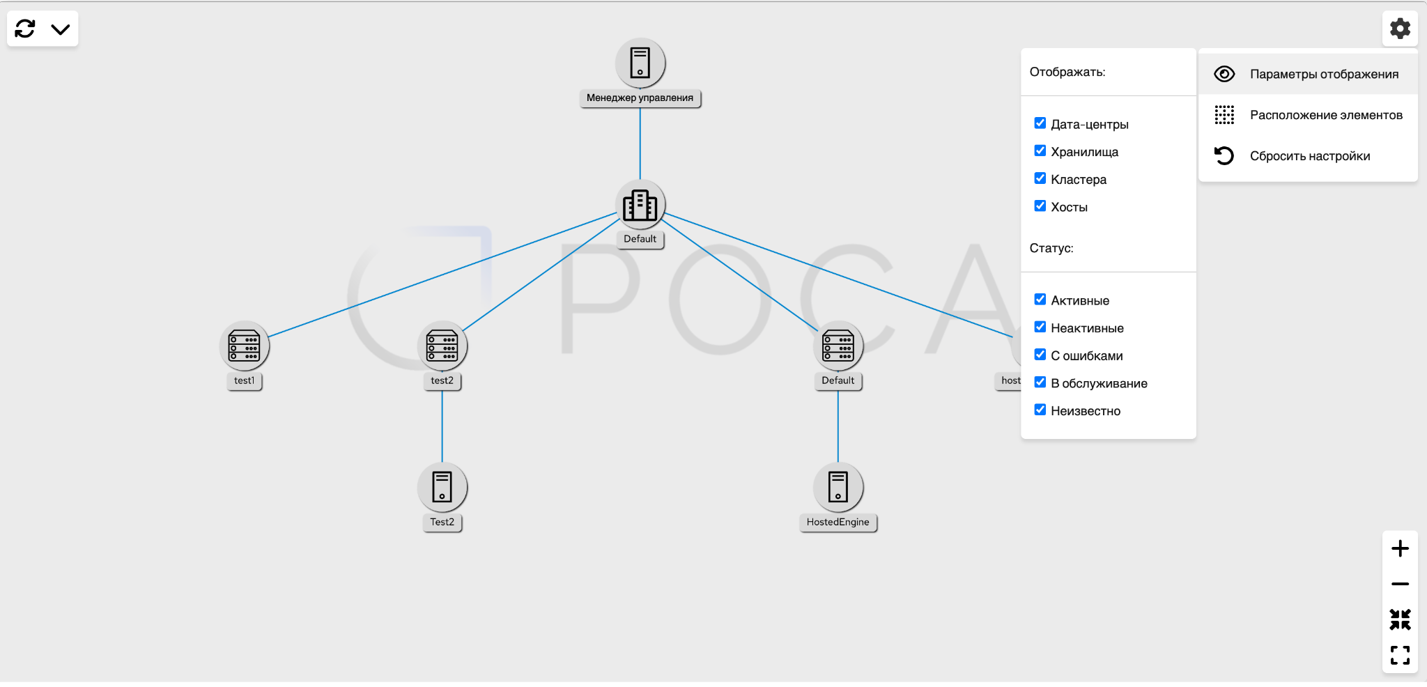 - Параметры отображения ‒ позволяет выбрать элементы для отображения на схеме, например дата-центры, кластеры, узлы и другие сущности. Выбор осуществляется через фильтры, что помогает скрывать ненужные элементы и улучшать восприятие визуализации (рисунок 35).