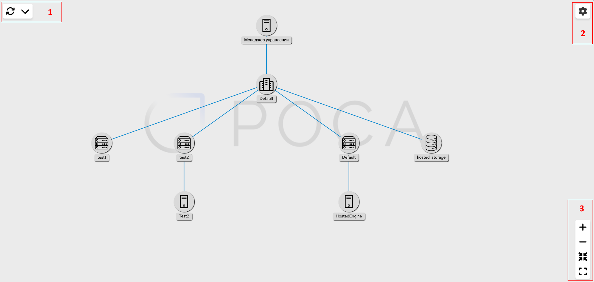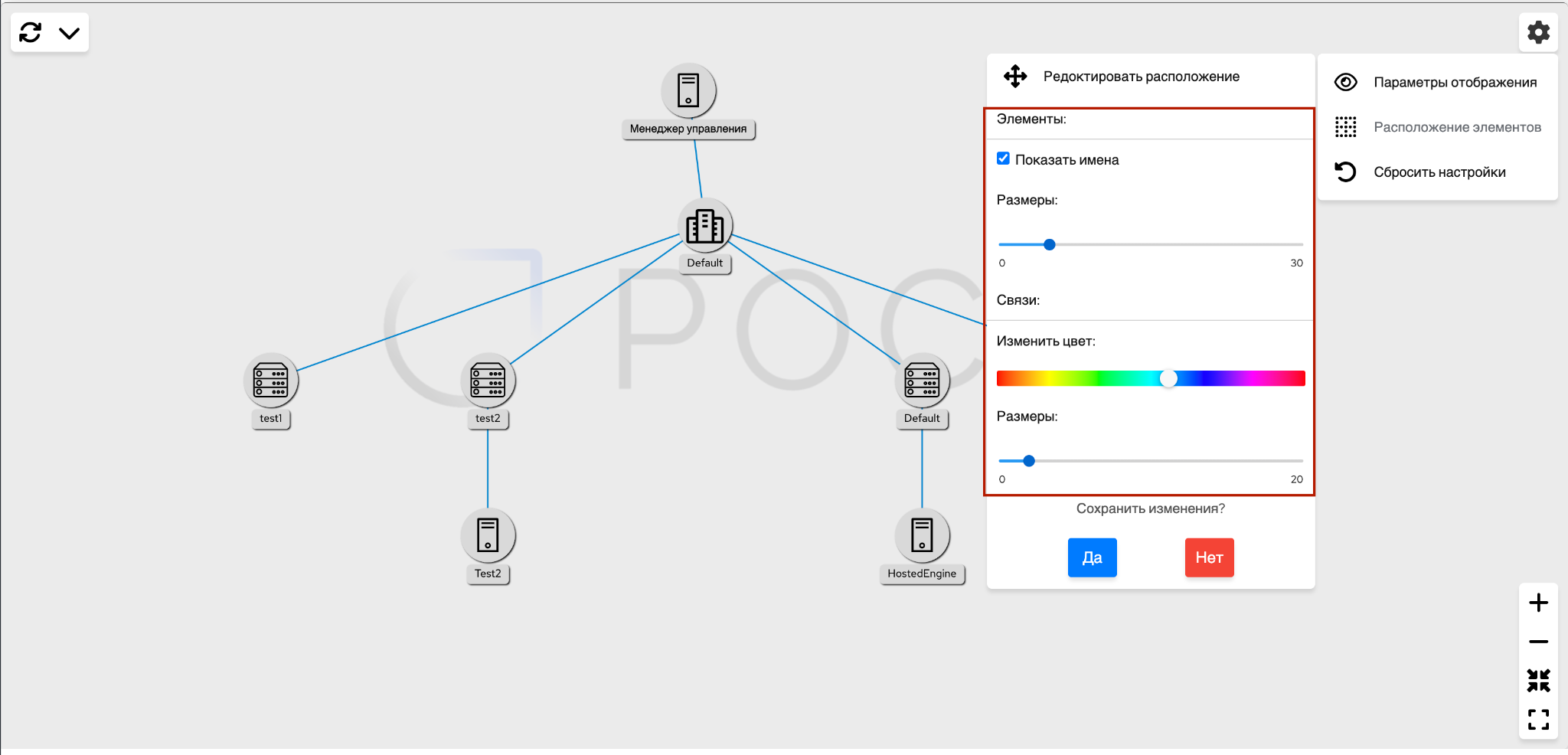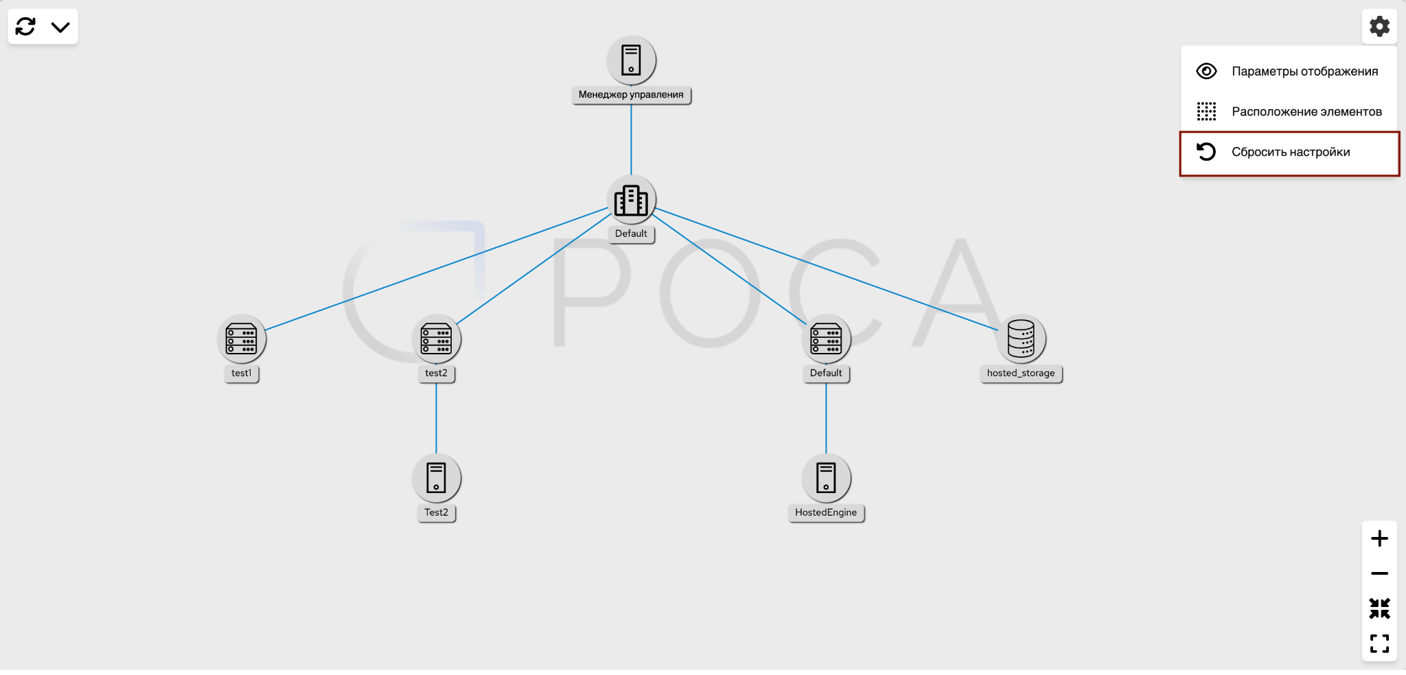 - Параметры отображения ‒ позволяет выбрать элементы для отображения на схеме, например дата-центры, кластеры, узлы и другие сущности. Выбор осуществляется через фильтры, что помогает скрывать ненужные элементы и улучшать восприятие визуализации (рисунок 35).