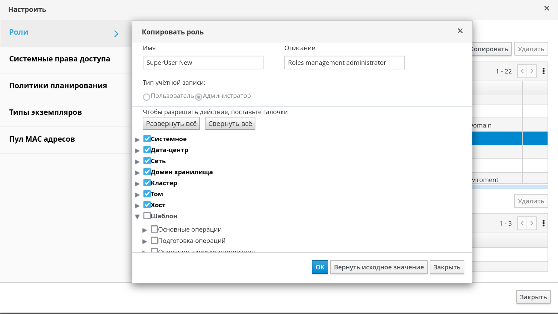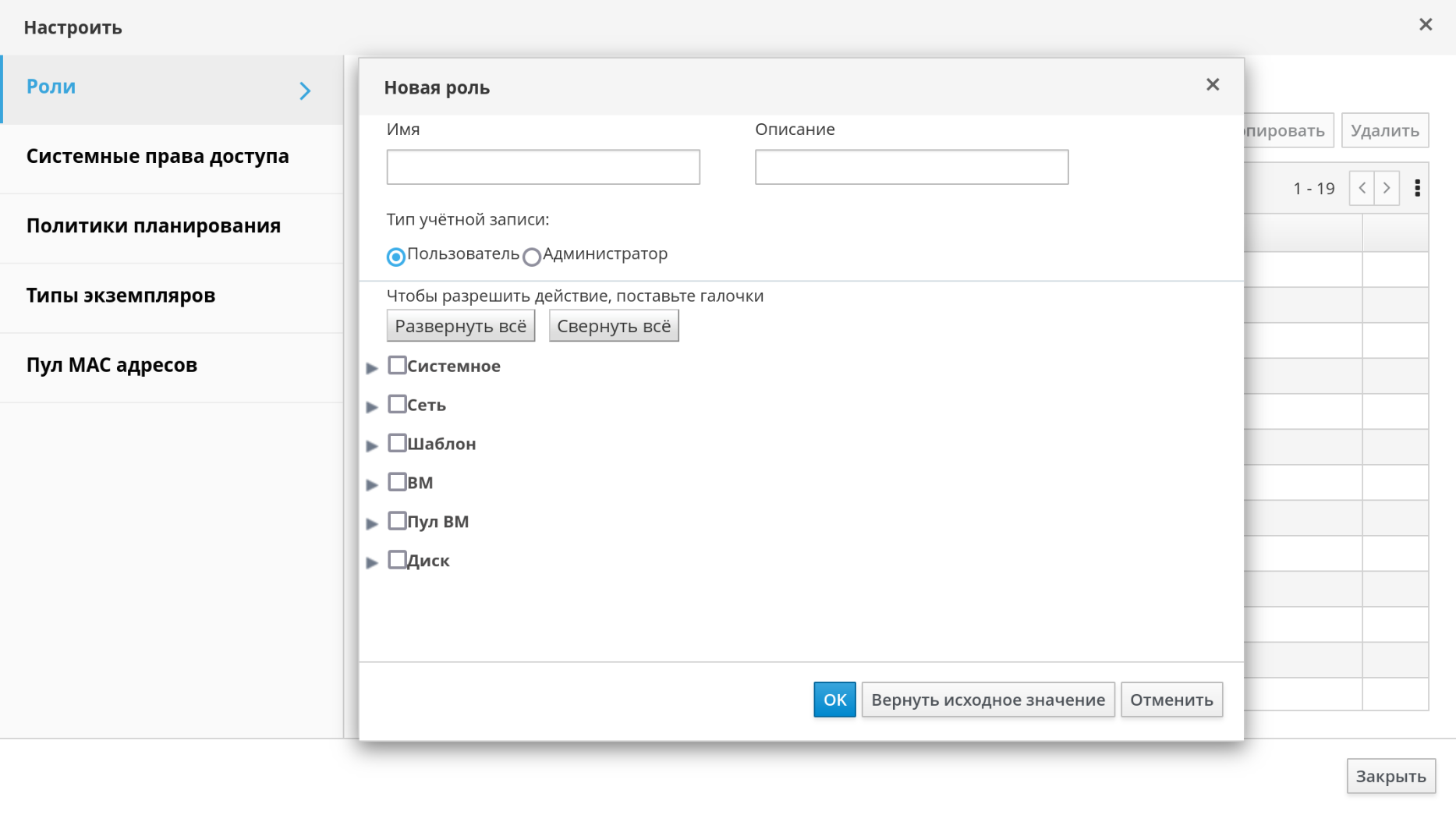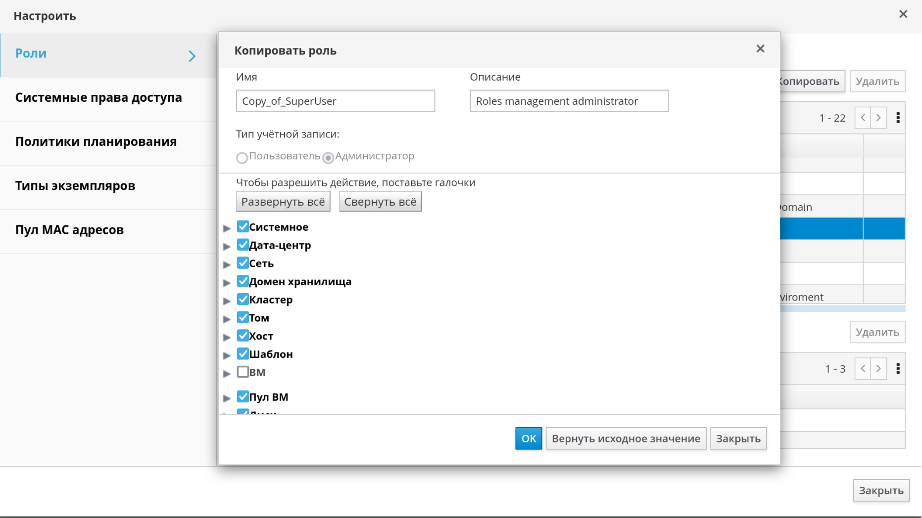 Если требуемая роль отсутствует в изначальном списке ролей Системы виртуализации, то можно создать новую роль и настроить эту роль согласно требованиям и целевому назначению.