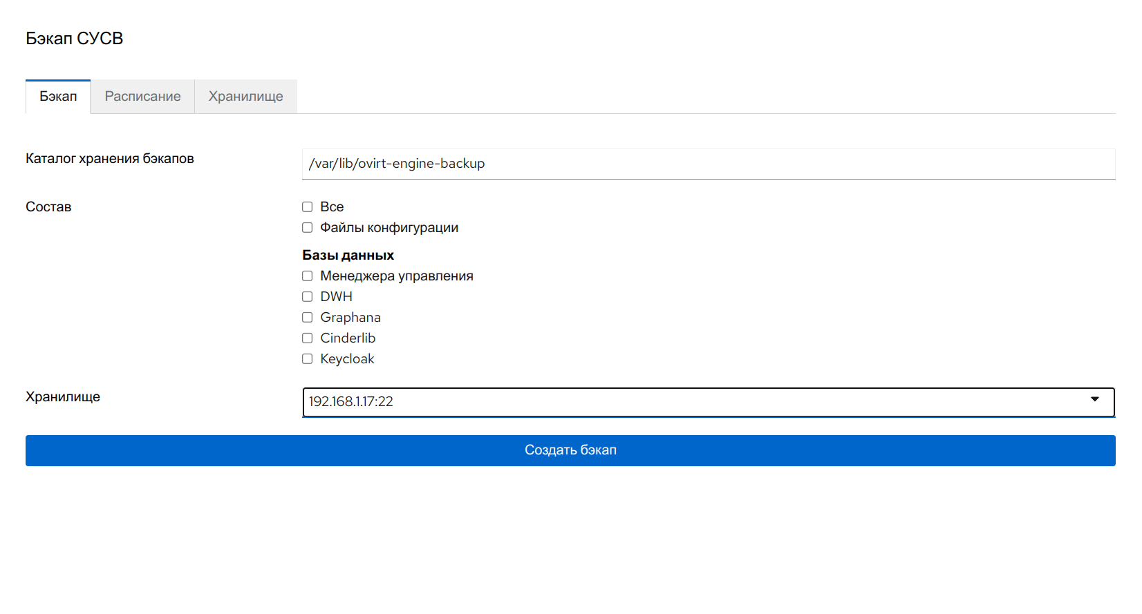 all‒ полная резервная копия всех БД и файлов конфигурации СУСВ. Это является значением по умолчанию для параметра —scope;files‒ резервная копия только файлов в Системе;db‒ резервная копия только БД СУСВ;dwhdb‒ резервная копия только БД хранилища данных;cinderlibdb‒ резервная копия только БД Cinderlib;grafanadb‒ резервная копия только БД Grafana.