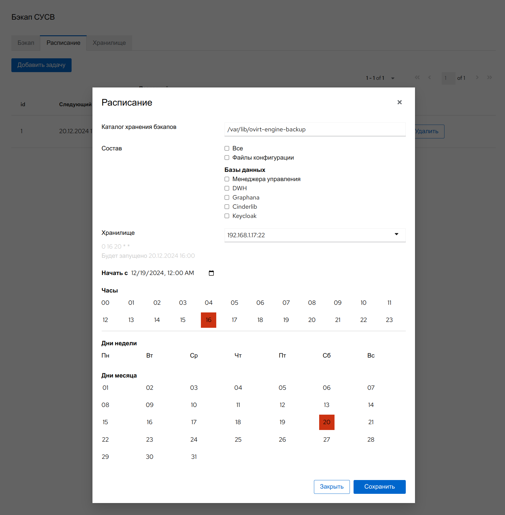 all(по умолчанию) — для создания резервной копии или восстановления всех баз данных и данных конфигураций;files— для создания резервной копии или восстановления только файлов Системы;db— для создания резервной копии или восстановления только БД СУСВ;dwhdb— для создания резервной копии или восстановления только БД хранилища данных.
