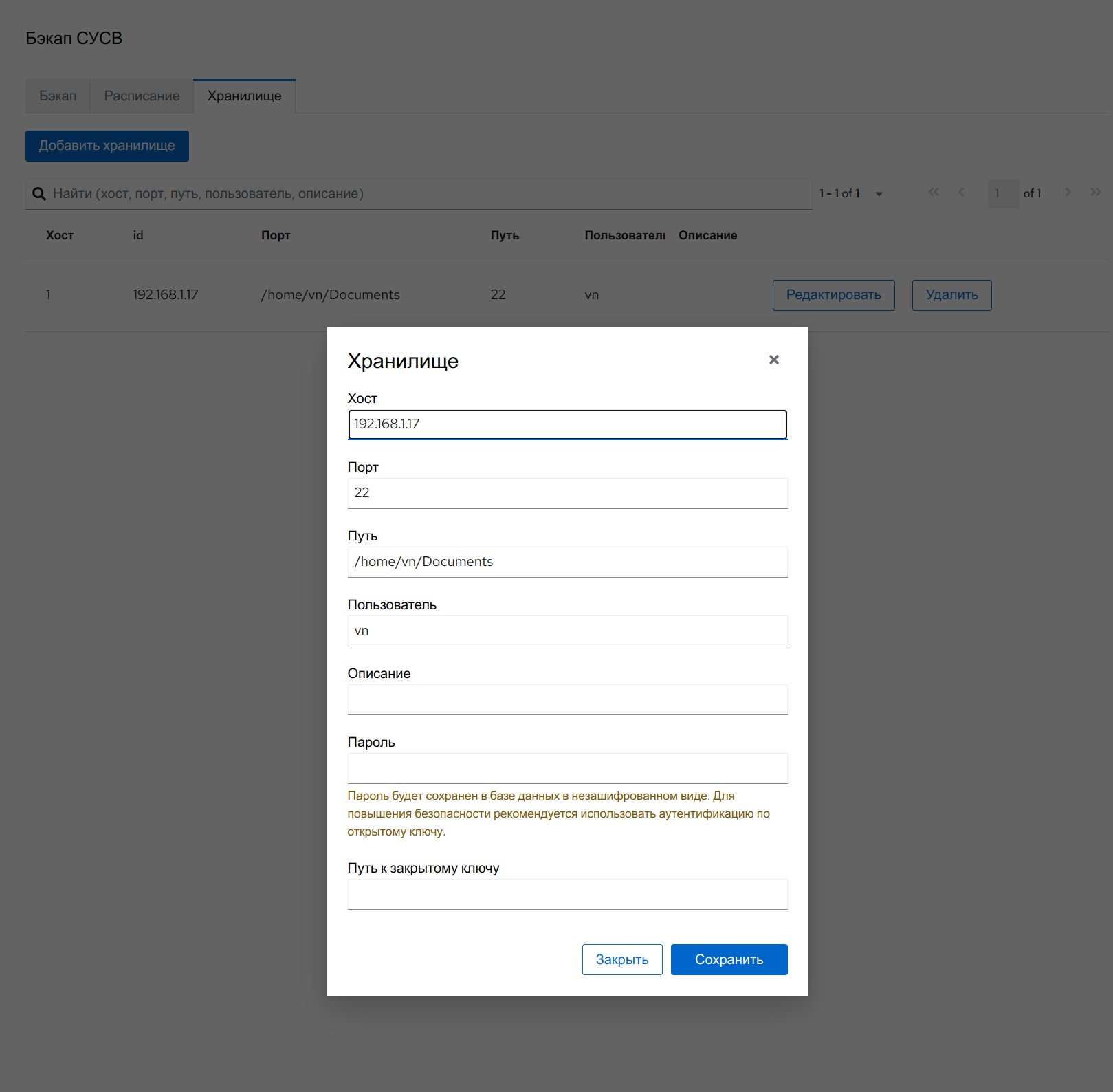 - Для восстановления из резервной копии в свежей установке СУСВ недостаточно только архива с БД СУСВ, также нужен доступ к файлам конфигурации. При указании области действия, отличной от all, необходимо также указать