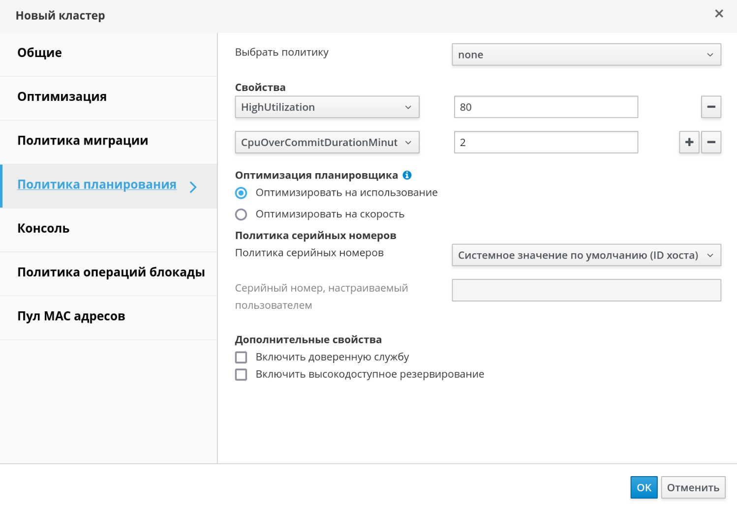 - перейти на вкладку "Политика планирования", чтобы при необходимости настройки политики планирования указать параметры оптимизации планировщика, включить доверенную службу для хостов в кластере, включить резервирование высокой доступности и добавить частную политику порядковых номеров (рисунок 108);